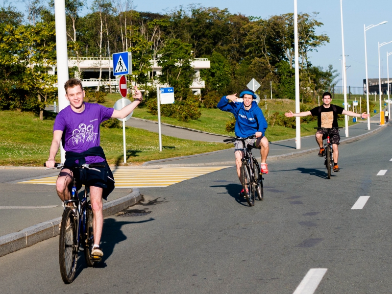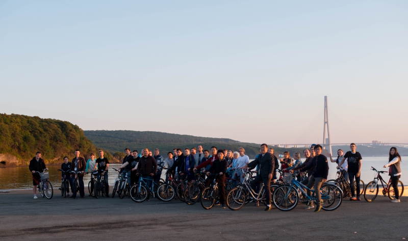 Эстафету седьмой велопрогулки приняли сотрудники Международного научно-исследовательского центра нанофотоники и метаматериалов во главе с доктором наук Павлом Беловым, которые в данный момент находятся во Владивостоке на конференции «МЕТАНАНО». Начатое в Петербурге они продолжили здесь, на востоке России: делегация ученых в составе почти 40 человек прокатилась по набережной кампуса Дальневосточного федерального университета, доехала до Русского моста, потом к Ворошиловской батарее и обратно. Среди участников прогулки, составившей в итоге 10 километров, профессора, кандидаты наук и аспиранты Университета ИТМО, МГУ им. М.В.Ломоносова, Университета Саутгемптона (Великобритания), Университета Аалто (Финляндия), Сингапурского института хранения данных (Сингапур), Технологического Университета Суинберна (Австралия), Фуданского университета в Шанхае (Китай).