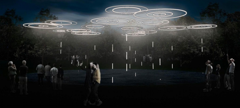 Инсталляция команды магистрантов Высшей школы светового дизайна Ольги Поскрёбышевой, Натальи Фроловой, Кирилла Варавина и Альберта Мухина расположится на Круглом пруду Гатчинского парка, который в диаметре достигает порядка 20 метров. Здесь на протяжении фестиваля любой желающий сможет увидеть дождь, который нарушает законы физики. Глядя на небо в дождливую погоду, мы видим, как капли падают сверху вниз, когда же мы смотрим на водную гладь, мы можем увидеть отражающееся в ней небо. Авторы проекта предлагают задуматься, а что если все процессы будут протекать с точностью наоборот?