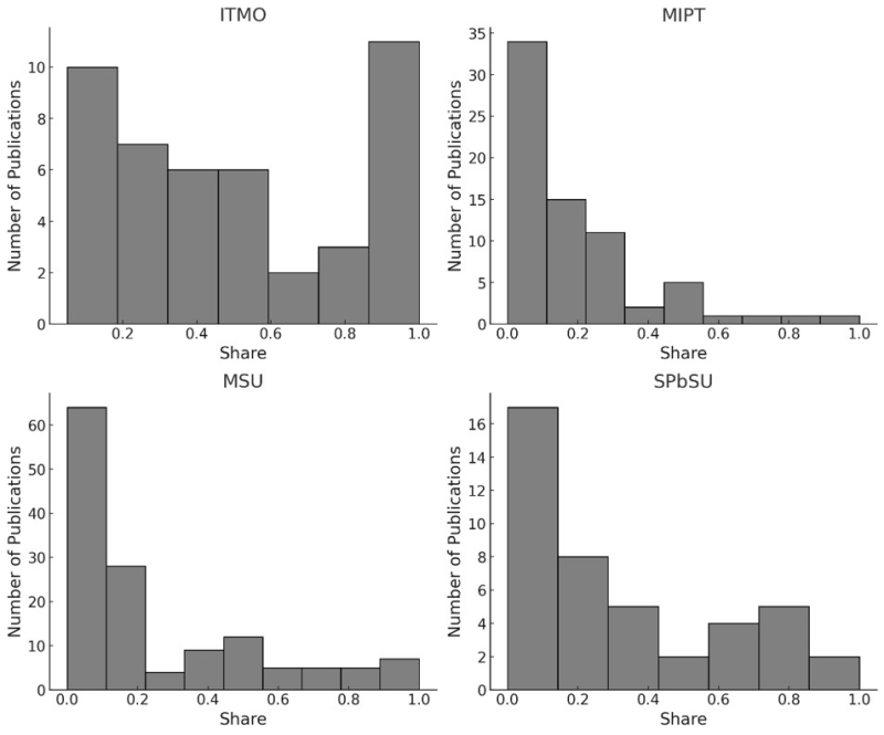 Распределение долей участия в публикациях для университетов ИТМО, МФТИ, МГУ и СПбГУ. Гистограммы отражают количество публикаций в зависимости от значения доли участия авторов, представляющих каждый из университетов. ИТМО имеет значительное количество публикаций с высокой долей (близкой к 1), в то время как МФТИ, МГУ и СПбГУ характеризуются большим числом публикаций с низкими значениями доли. Это означает, что коллективы в ИТМО способны достигать прорывных научных результатов в рамках лабораторий непосредственно внутри Университета. Схема предоставлена Алексеем Пельтеком