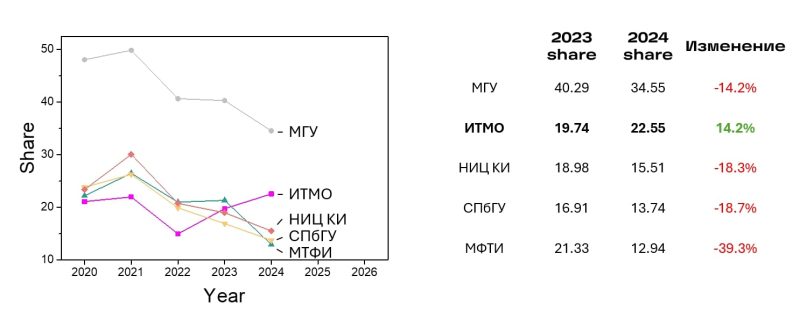 Динамика долей участия в научных публикациях российских университетов и научных организаций в 2020–2024 годах. На графике представлены изменения доли (Share) публикационной активности ведущих российских организаций: МГУ, ИТМО, НИЦ Курчатовский институт, СПбГУ и МФТИ. Доля МГУ остается значительно выше остальных, несмотря на тенденцию к снижению, тогда как ИТМО демонстрирует устойчивый рост после спада в 2022 году. Из топ-5 университетов России, фигурирующих в рейтинге Nature Index, ИТМО — единственный университет, который показывает рост вклада в публикации в высокоимпактных журналах Nature Index за последние два года. Схема предоставлена Алексеем Пельтеком