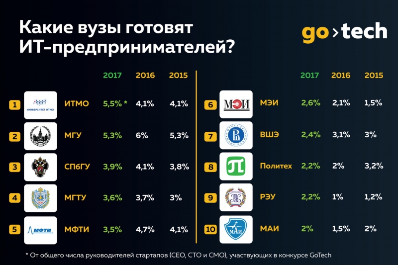 На протяжении последних двух лет в пятерку вузов с самой высокой предпринимательской активностью традиционно входили МГУ, СПбГУ, Университет ИТМО, МГТУ им. Баумана и МФТИ. Однако в этом году Университет ИТМО впервые занял первую строчку рейтинга. Среди стартапов-участников конкурса GoTech 2017 5,5% руководителей проектов составляют выпускники и студенты этого университета, отмечают представители компании.