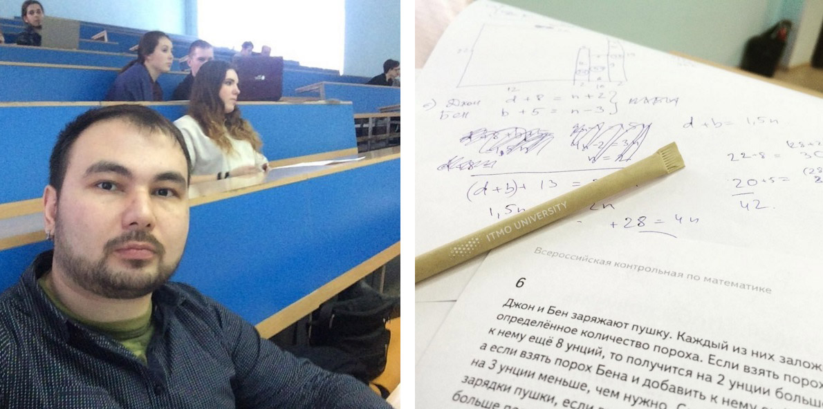«Математика всегда доставляла мне большое удовольствие. Весь процесс — от прочтения условий задачи до нахождения ответа — заставляет мозг шевелиться, а ощущение, что я могу сам дойти до решения даже очень сложной задачи, всегда поднимает настроение, — делится впечатлениями „отличник“ Руслан Диль, пришедший на акцию в Университет ИТМО. — Я решил проверить свои силы, удостовериться, что все еще знаю математику на „пять“, как это было в школе и университете. В школе города Ашхабад, где я учился, я был постоянным участником олимпиад по математике и занимал первые места в соревнованиях как городского, так и федерального уровней. Жизнь также связал с точными науками, став инженером-программистом. В Университете ИТМО я решил писать, потому что очень хотелось посмотреть на вуз изнутри. К тому же это веселее, чем сидеть дома перед компьютером. В атмосфере вуза, в аудитории за партой, перед „преподавателем“, проще собраться и показать лучший результат».