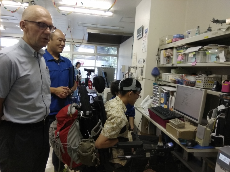 Андрей Зленко: В этот центр люди с ОВЗ приходят за техническими средствами реабилитации (ТСР). Если в наличие есть необходимые, они могут их приобрести по доступной стоимости. Если же нужных приспособлений нет, сотрудники центра отправляются в исследовательский блок с целью оперативно придумать и реализовать решение проблемы. Все девайсы для инвалидов разрабатывает специализированный центр в Токио.